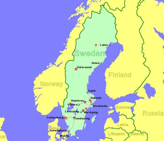 Mapa lotnisk w Szwecji. Lotniska w Szwecji mapę (Europa Północna Europa) do druku. Lotniska w Szwecji mapę (Europa Północna Europa) pobierz. W 2004 roku istniało około 254 lotnisk. W 2005 r. łącznie 155 lotnisk miało utwardzone pasy startowe, a ponadto istniały dwa heliporty, jak pokazano na mapie lotnisk w Szwecji. Międzynarodowy port lotniczy Arlanda w Sztokholmie przyjął pierwszy samolot odrzutowy w 1960 r.; inne główne porty lotnicze to Sturup w Malmö i Landvetter w Goeteborgu. Skandynawskie Linie Lotnicze SAS (Scandinavian Airlines System) są prowadzone wspólnie przez Szwecję, Danię i Norwegię, z których każda posiada 50% udziałów w spółce działającej na jej terytorium; druga połowa w Szwecji należy do prywatnych inwestorów. Linjeflyg, spółka zależna SAS, obsługuje połączenia krajowe do większości większych miast i kurortów. W 2003 roku, około 11,586 mln pasażerów zostało przewiezionych na regularnych lotach krajowych i międzynarodowych.